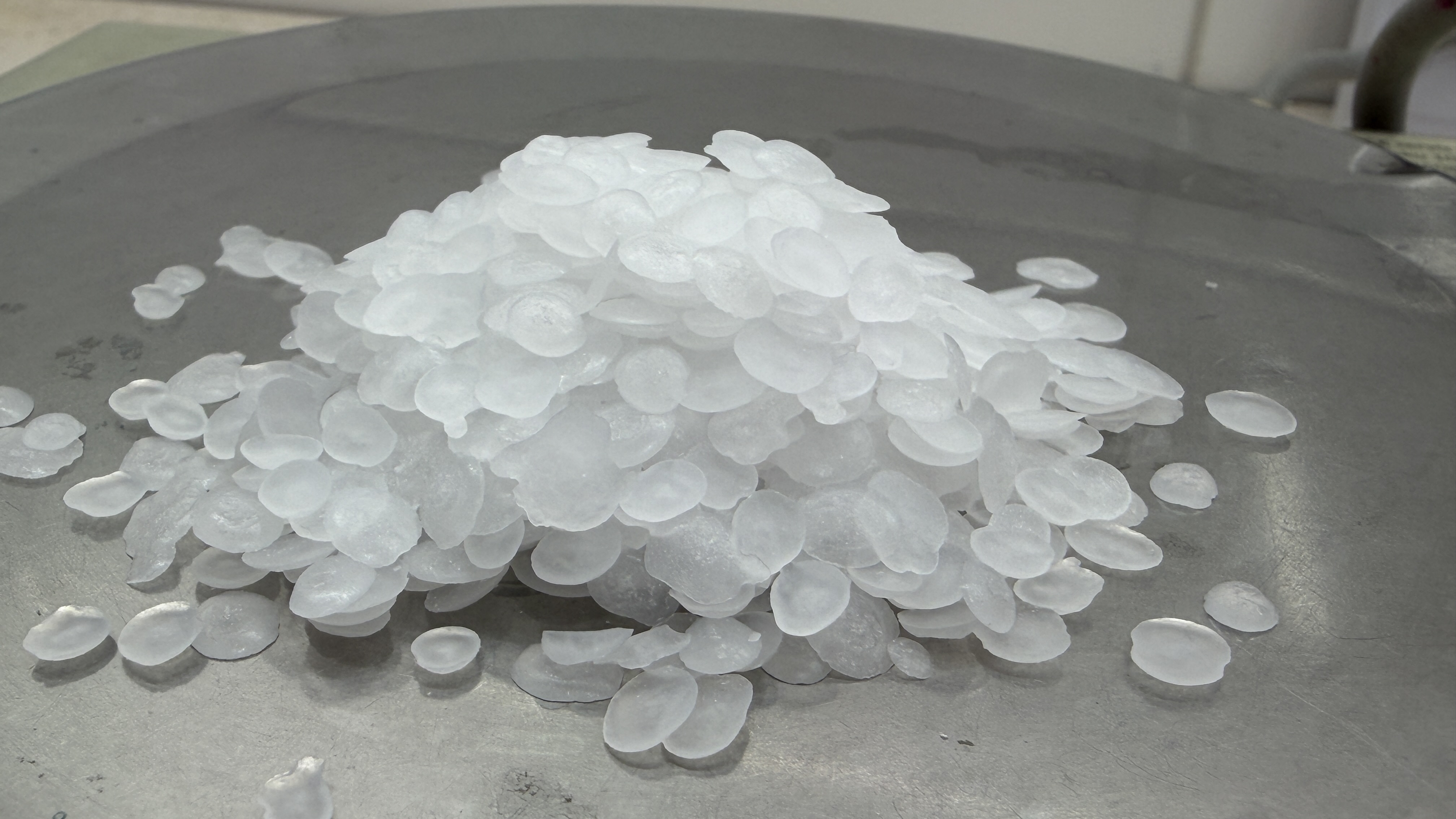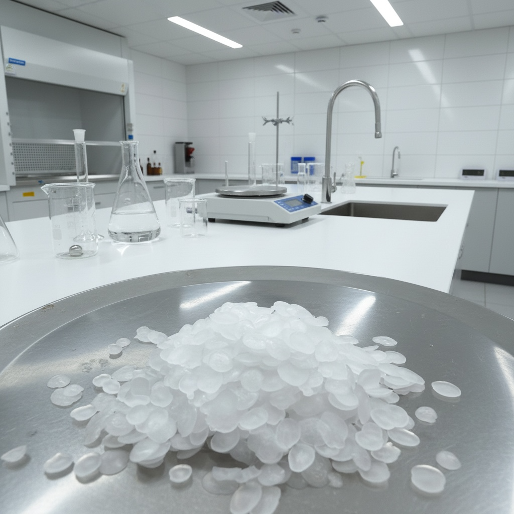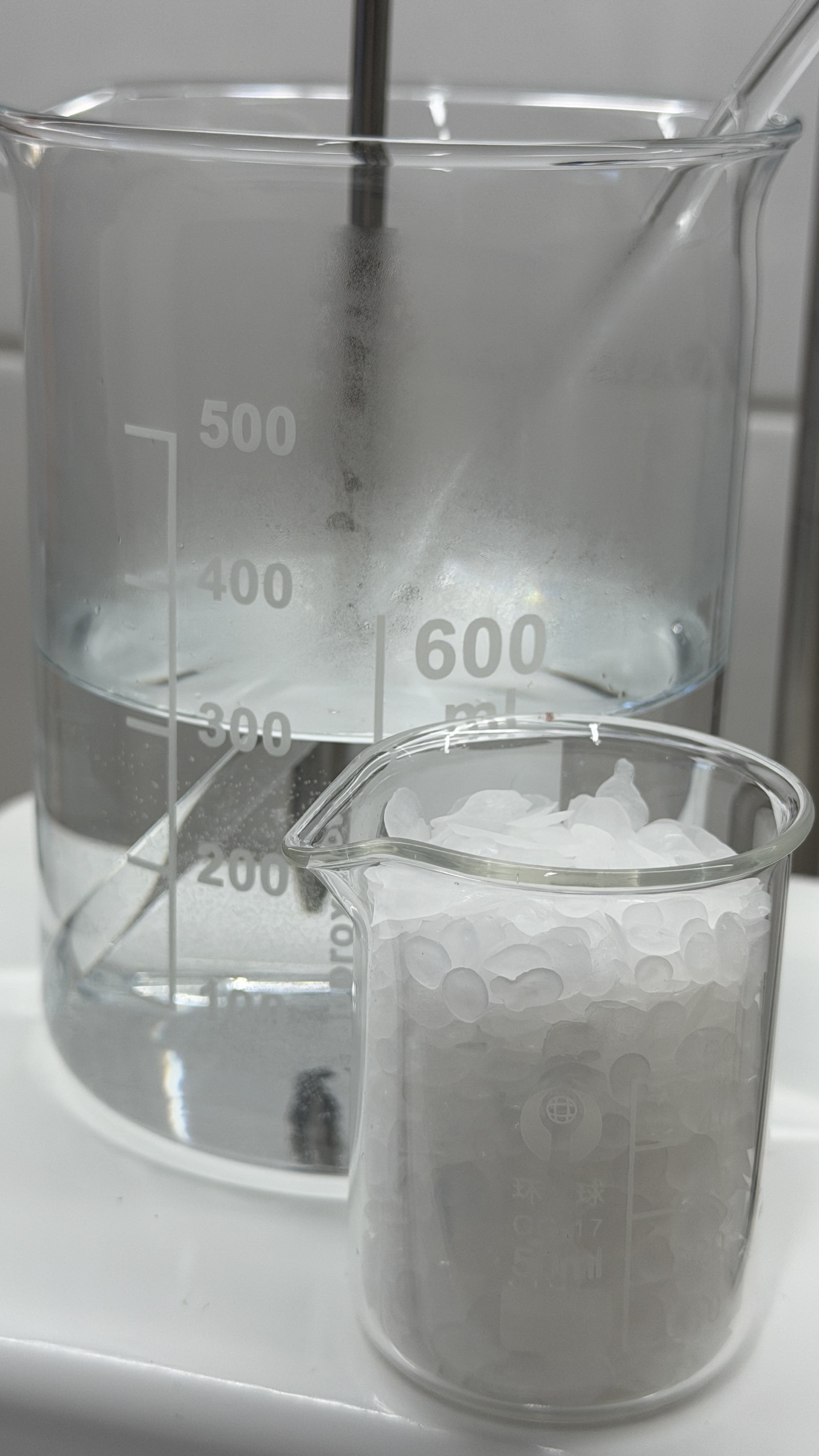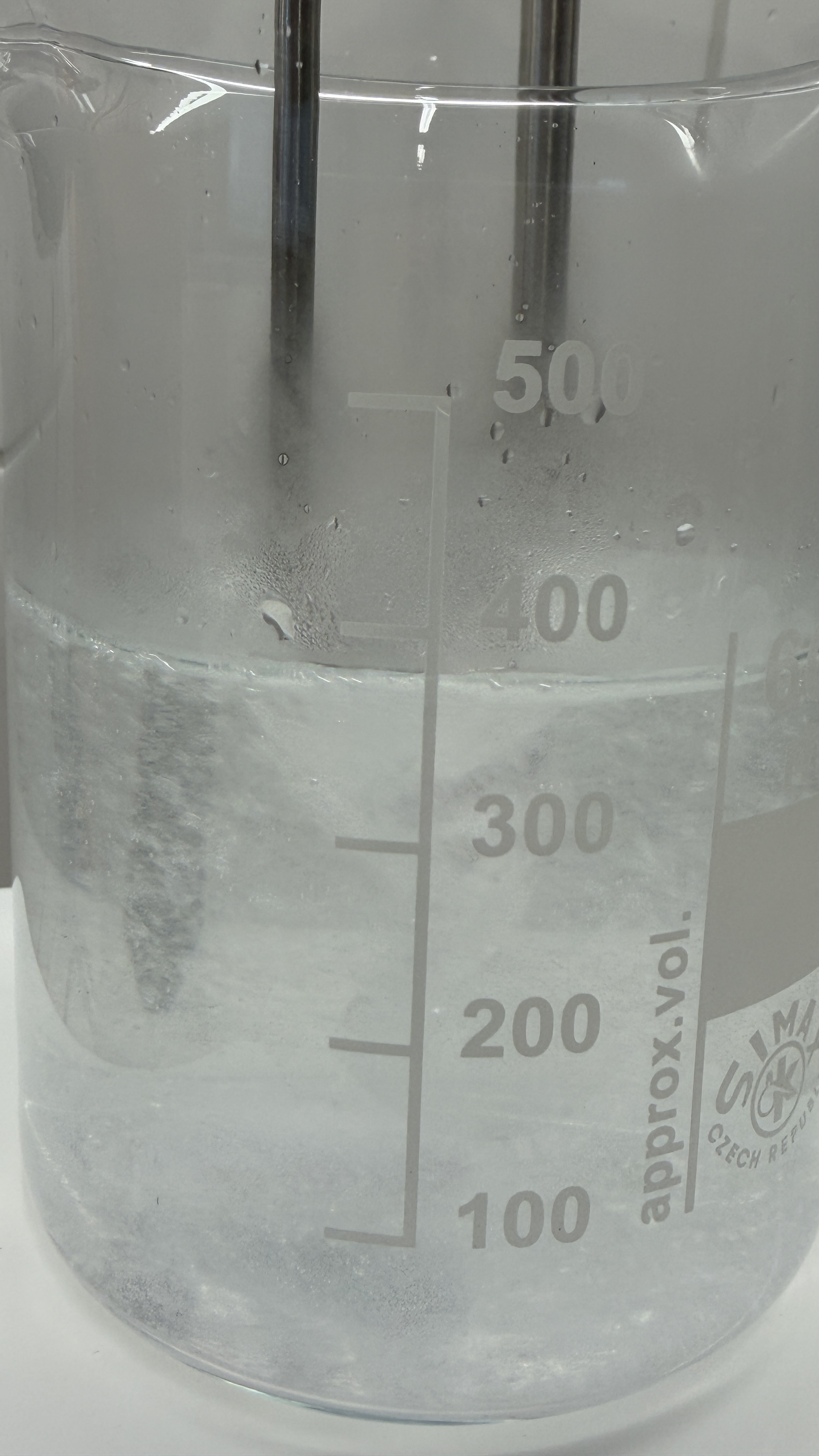 Naše surovina se při doporučeném dávkování důkladně a rovnoměrně rozpouští bez zbytkového kalu či zákalu, což dokládáme reálnými fotografiemi z přípravy lázně. U méně kvalitních nebo technických surovin se může při vyšší koncentraci objevit sediment nebo zakalení vody. Čistota a rozpustnost jsou proto zásadním parametrem kvality. (V testu použito 50g suroviny na 300 ml vody, doba míchání cca 90 sec.)