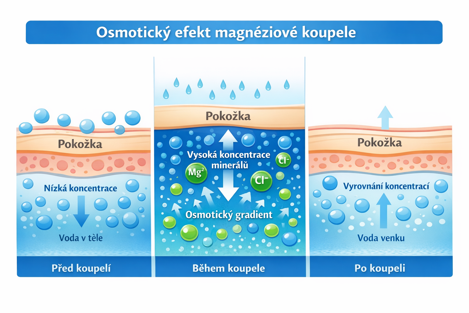 Na rozhraní pokožky a lázně vzniká osmotický gradient, tedy rozdíl koncentrací mezi dvěma prostředími oddělenými biologickou membránou. Dochází k vyrovnávacím procesům, které jsou v balneologii popisovány jako osmotický a iontový efekt minerální lázně. V praxi se projevují zesílením pocitu prohřátí, podporou lokální mikrocirkulace a subjektivním uvolněním svalového napětí. Čím vyšší koncentrace v rámci doporučeného dávkování, tím výraznější je tento fyzikální efekt.